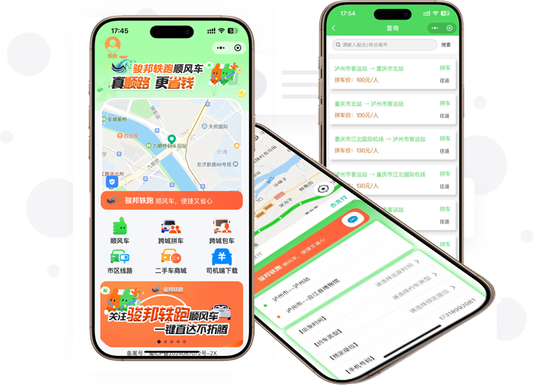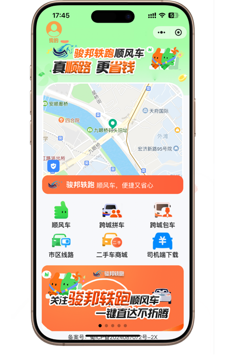 骏邦轶跑是由泸州市骏邦汽车服务有限公司创立的顺风车信息服务平台,于2024年11月上线,是以“私人小客车合乘”以车主自身出行需求为前提,分摊部分出行成本的共享出行服务。不以盈利为目的。骏邦轶跑顺风车满足各位同行人员的“真顺路,低费用”的出行需求,更省心的选择。软件名称:骏邦轶跑 软著认 000338517号 认证号:2025SA0148071 备案号:蜀ICP备2024087072号-2X